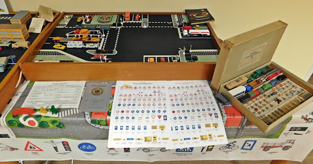 Die kleinere Schautafel ist etwas neuer, vermutlich aus den 1970ern, die große stammt wohl aus den 1960ern. Rechts zu sehen der kleine Schulsatz, wie er bei Wiking zu beziehen war. Als Unterlage der Präsentation diente die Verkehrstischdecke des RGG-Verlags (Rot-Gelb-Grün) aus den 1970ern.